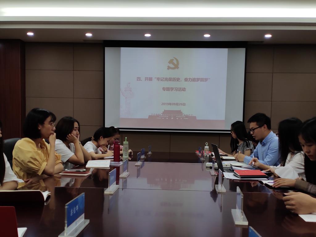 活动开始,全体党员起立,齐唱中华人民共和国国歌,并由组织委员带领大家重温入党誓词。新生党员依次作自我介绍,表达了对组织生活的期待和向往,支部书记薛励玥同志代表党支部向他们表示欢迎。然后,支部书记薛励玥根据学校和学院党委的有关要求,结合支部具体情况开展“不忘初心,牢记使命”主题教育的动员部署,围绕“我和我的祖国”主题内容,由杨瑞、王锐等新生党员发表了自己有关“牢记光荣使命、奋力追梦圆梦”专题的感想,结合自身的实践经历和感受,深切地体会到祖国的飞速发展,人民生活日新月异的变化。接下来,全体党员集中观看了反映祖国七十年成就的系列短片——《共和国发展成就巡礼-湖北篇》,进一步了解了70年来中国共产党带领全国各族人民进行社会主义革命、建设、改革取得的辉煌成就,并邀请部分党员同志发表自己的看法。