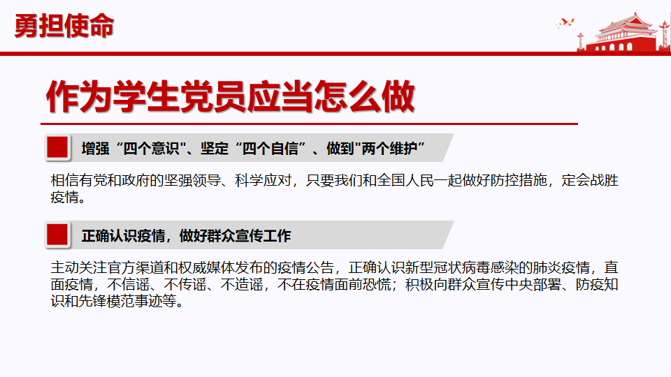 支部宣传委员郭琳炜表示,当前疫情防控进入了关键阶段,广大党员除了要增强自身的政治意识,做好个人防护,更重要的是挺身而出,英勇奋斗,扎实开展学习,并充分发挥密切联系群众的优良作风,团结带领广大人民群众坚定不移把党中央决策部署落到实处,构筑群防群治的严密防线。