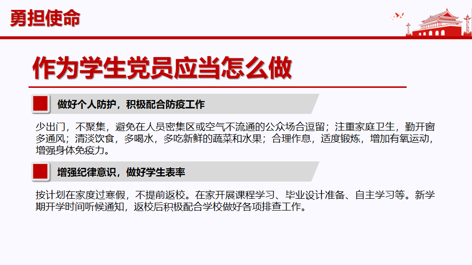 抗击疫情最重要的是落实行动。支部组织委员林昕雨在分享个人做法时谈到,面对疫情最重要的是团结一致,共克难关,作为学生党员,我们在做好个人防护的同时,更应该为社区、为学校、为群众出一份力,例如通过拍摄视频宣传防疫知识、分享先锋模范事迹、提供必要的心理辅导和沟通交流、投身体温监测点或社区服务中心等志愿服务工作等。