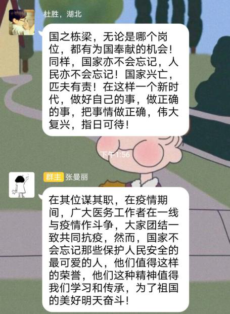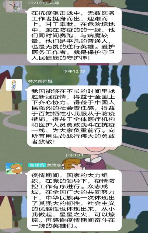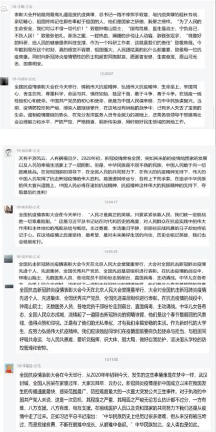我院各学生支部在观看了表彰大会直播后,在学生群里展开了热烈讨论,积极发表自己的感想。作为当代青年的我们,要积极学习抗疫英雄们甘于奉献的精神正如钟南山院士所说“生逢盛世,当不负盛世”作为学生党员的我们应该不忘初心,牢记使命,勇往直前,做好科研工作的同时为国家和社会贡献出我们自己的力量