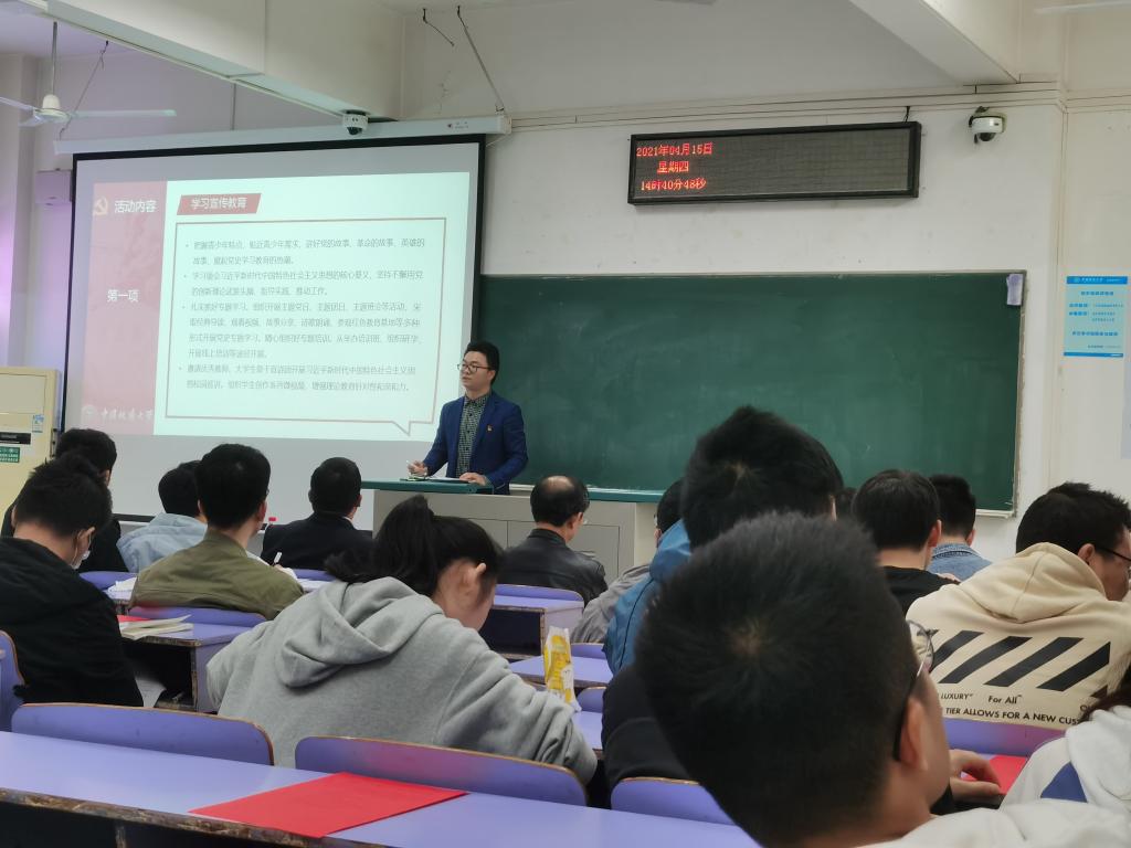 在教三楼406教室召开庆祝建党100周年暨党史学习教育工作推进会。学院党委书记董浩斌老师、党委副书记何建新老师、学工组刘一荻老师,学生支部书记及支委、团委学生会主要干部、本科生班长团支书、研究生班长团支书参加本次会议。本次会议由黄兰华老师主持。