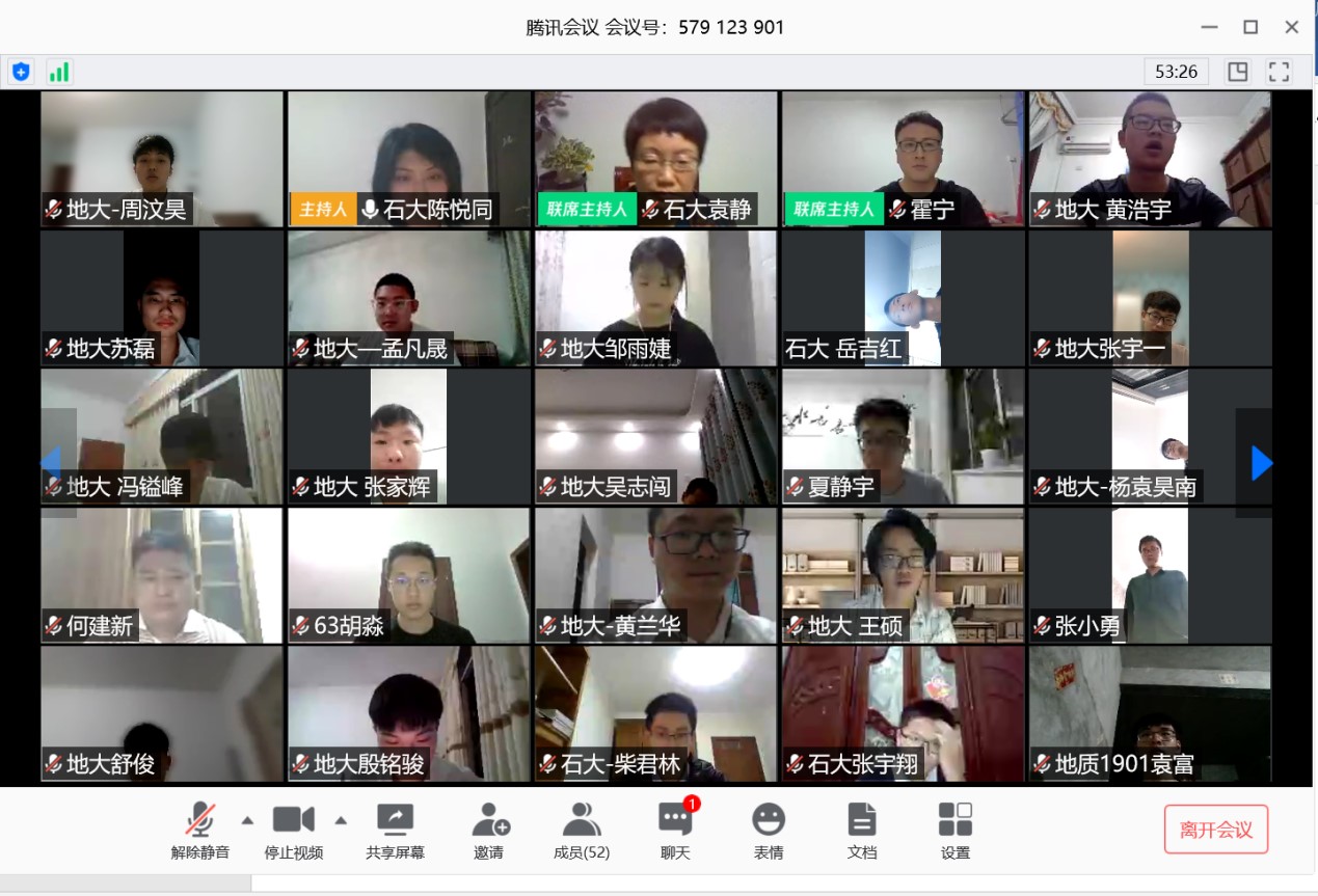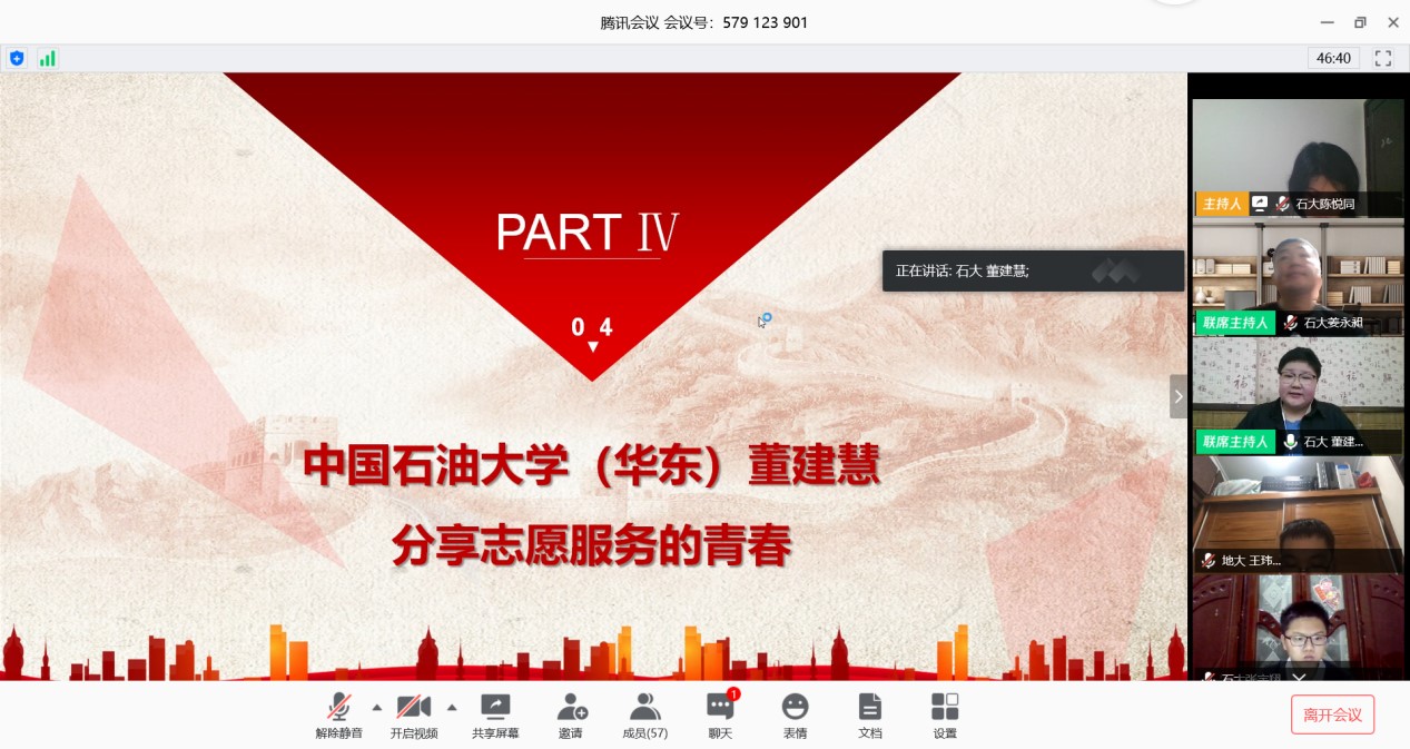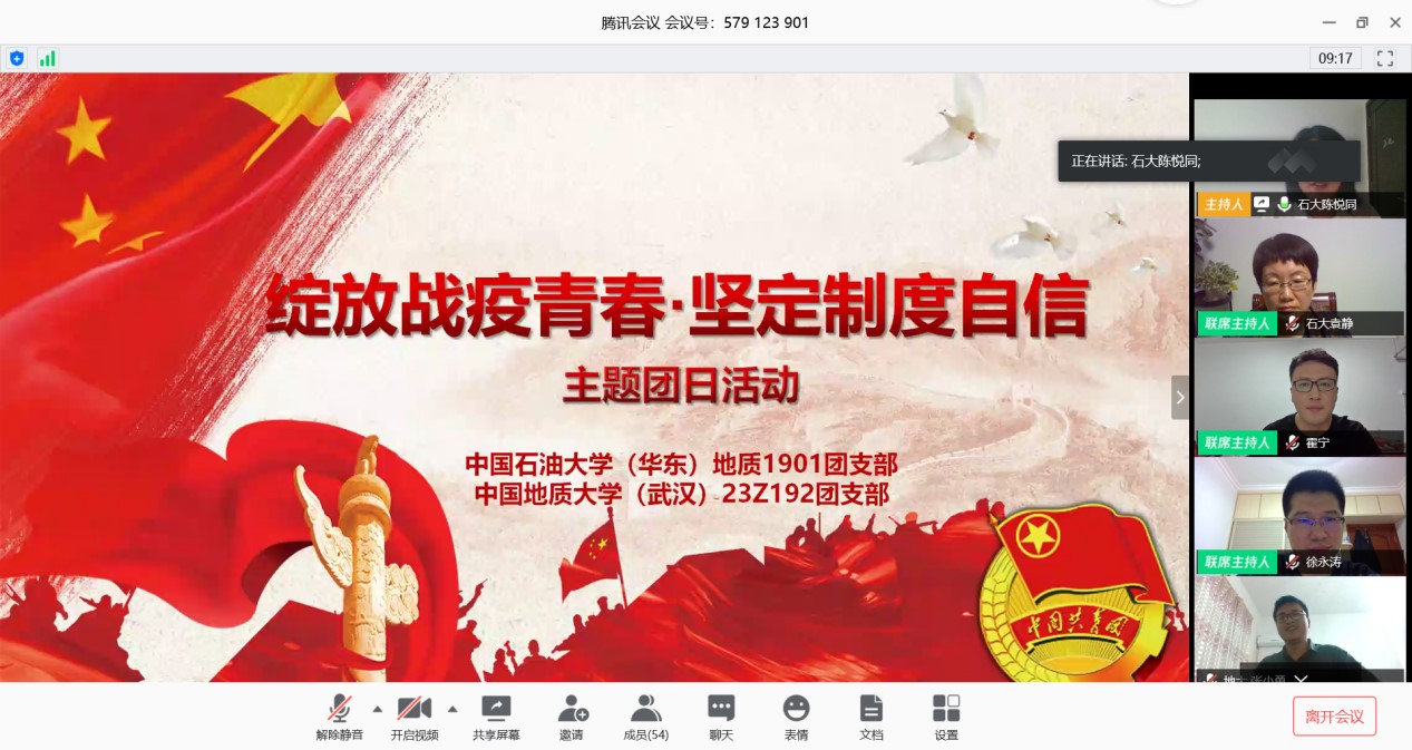 围绕这次疫情大考中国展现出来的制度优势和当代青年责任担当,中国地质大学(武汉)和中国石油大学(华东)多名同学发表了自己的看法。地大的徐源徽同学说到:“这次疫情对于广大青年而言是一次特殊的‘成人礼’,我们用行动证明:新时代的中国青年是好样的,是堪当大任的。”地大的孔思栋谈到:”我们每个人也要用青春去践行五四精神,让青春在为祖国,为人民,为民族,为人类的奉献中焕发出更加绚丽的光彩。” 地大的张宇一说:“在党和政府的领导下,复工复产正在有序推进,勤劳勇敢的中国人民一定能战胜疫情。”石大的刘璐璐说:“我敬畏那些在疫情中奉献的青年,我敬佩他们勇于担当,不畏艰险。”最后,石大地质1901的班长柴君林和地大23Z192班的团支书周汶昊做表态发言,周汶昊说到:“我们青年人将不负建功立业的人生际遇,不负天降大任与斯人的时代使命,不负党的期望、人民的期待、民族的重托,用努力奋斗的青春,使自己成长为一个有理想、有本领、有担当的时代新人。我们青年要在为人民服务中茁壮成长,在艰苦奋斗中砥砺意志品质,在实践中增长工作本领,让青春在党和人民最需要的地方绽放绚丽之花。”