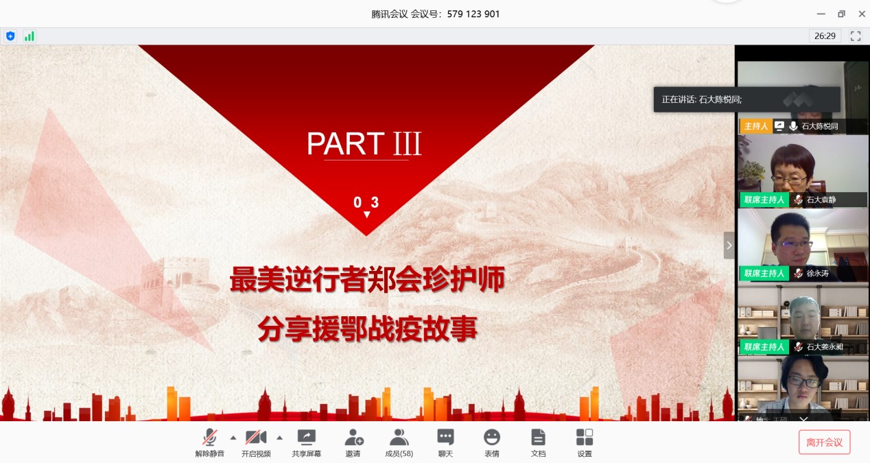 山东大学齐鲁医院内分泌科护士长郑会珍分享赴鄂抗疫故事,郑护士主要负责协调医疗仪器、耗材及物资从而保障临床高效运转。从援鄂到结束,郑护士支援了整整两个月,她描述穿防护服的详细步骤,让我们直观地感受到医护人员的艰辛和不易。6小时未脱的防护服内浸满了汗水,为了节省医疗物资,她们选择在病房内尽量延长工作时间,虽然她们知道多待一会就会多一分危险。她谈到,“在武汉工作的这段时间里,我看到了和谐的医患关系,医生和病人相互理解和鼓励,这些都让我感动不已。我们要尽自己努力照顾好所有的病人,让所有的病人都能够康复出院。在抗击疫情斗争中,我看到了中国人民勇于承担、敢于奉献,拧成一股绳,可以战胜一切困难。”最后,她勉励同学们要不辱使命,不负韶华。