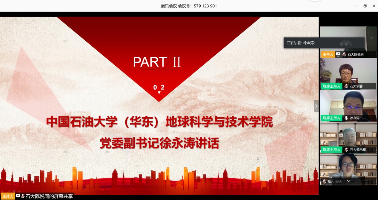 中国石油大学(华东)地球科学与技术学院党委副书记徐永涛围绕此次疫情彰显的制度优势,政局稳定,以人民为中心集中力量办大事,社会保障公平,人类命运共同体等进行讲述,他还分析了目前国外的局势,充分展现了中国在面对此次疫情所做出的巨大贡献,展现了党和国家的底线思维和忧患意识。他说:“在对于一个事物或者人,如果想要树立信念和信任,一开始要从理智上认同它,从而在感情上产生热爱,最后形成信仰”。他激励同学们要相信党和政府,要在奋斗中谱写大写的青春,让青春梦想在民族复兴的伟大梦想里尽情的绽放。