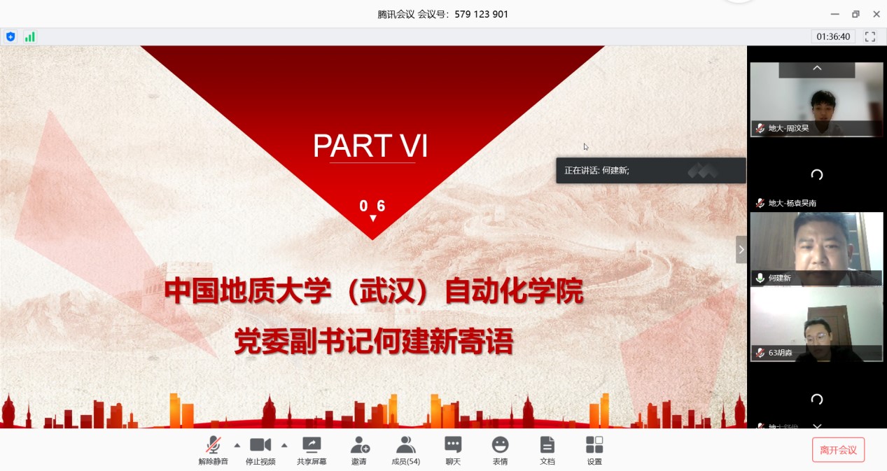 (通讯员:黄兰华 周汶昊)为学习贯彻习近平总书记关于疫情防控工作的系列重要讲话和指示批示精神,认真贯彻落实习近平总书记给北京大学援鄂医疗队全体“90后”党员的回信精神,5月2日晚19:30,中国地质大学(武汉)自动化类专业23Z192班与中国石油大学(华东)地质类1901班“云”端相聚,联合开展以“绽放战疫青春,坚定制度自信”为主题的线上团会。本次团会出席的嘉宾有中国地质大学(武汉)麻豆av