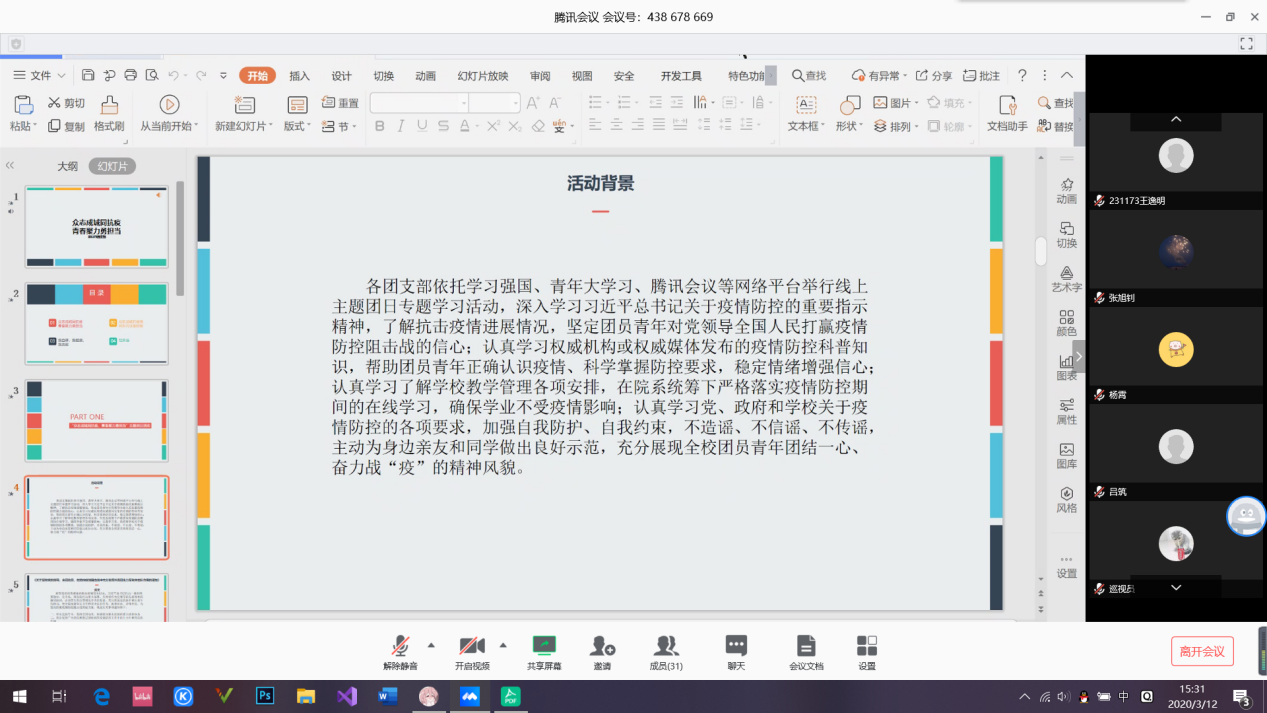 231173班3月12日通过线上会议(腾讯会议)召开了“众志成城同抗疫 青春聚力勇担当”主题团日活动,231173班全部同学及班主任参与团日活动,该团日活动由团支书张丰昱组织开展。