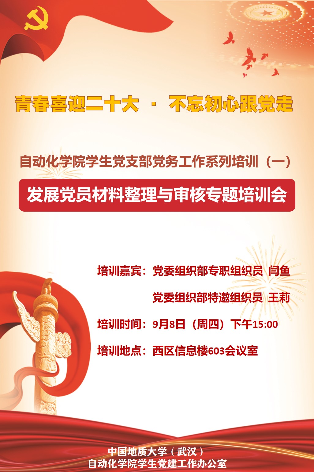 在信息楼603会议室开展了学生党支部党务工作专题培训的第一期——《发展党员材料整理与审核专题》,学院学生党建工作办公室特别邀请党委组织部专职组织员闫鱼老师、党委组织部特邀组织员王莉老师莅临现场指导,学院全体学生党支部支委参加本次专题培训。专题培训会由学院学生党建工作办公室主任黄兰华老师主持。