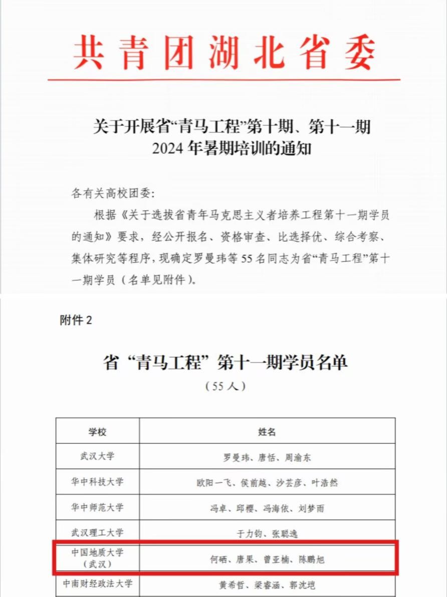 今年5月,共青团湖北省委、湖北省教育厅联合发布《关于选拔省青年马克思主义者培养工程第十一期学员的通知》,从湖北省20所高校中遴选55名大学生作为省“青马工程”第十一期学员。经公开报名、资格审查、比选择优、综合考察、集体研究等程序,我院2022级自动化专业本科生陈鹏旭同学成功入选!