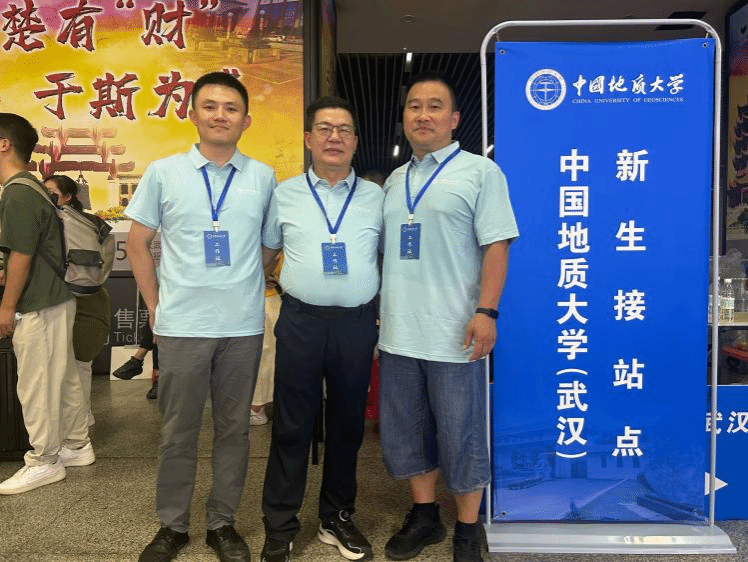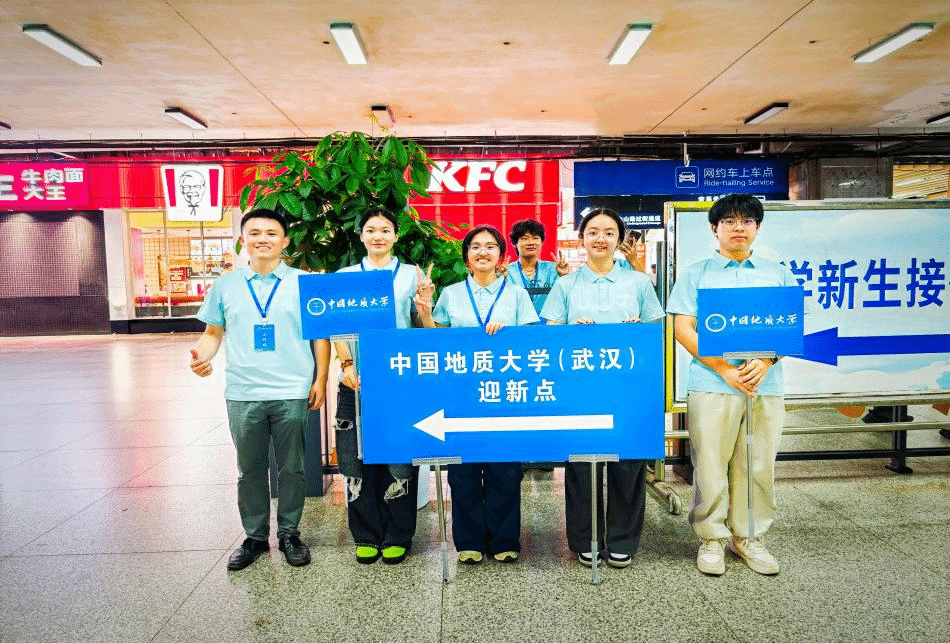迎新当日,我院党员教师志愿者携物资早早抵达武昌站接站点,10分钟内完成迎新点布设。志愿者们统一身着“地大蓝”文化衫、佩戴工作证,高举“麻豆av