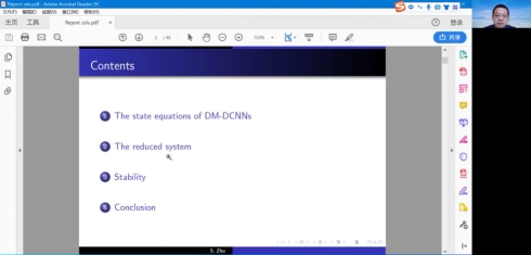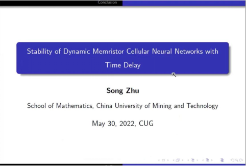 朱松教授是中国矿业大学数学学院资深教授,主要研究方向是随机系统稳定性理论、神经网络、忆阻器、流体网络。本次报告会朱教授介绍了基于忆阻的细胞神经网络模型,以及该神经网络的单稳定性和多稳定性及其联想记忆应用。朱教授用严谨并富有热情的报告给我院研究生介绍了具有时滞的动态忆阻细胞神经网络的稳定性研究进展,使学生们对忆阻细胞神经网络有了新的认识,收获良多。