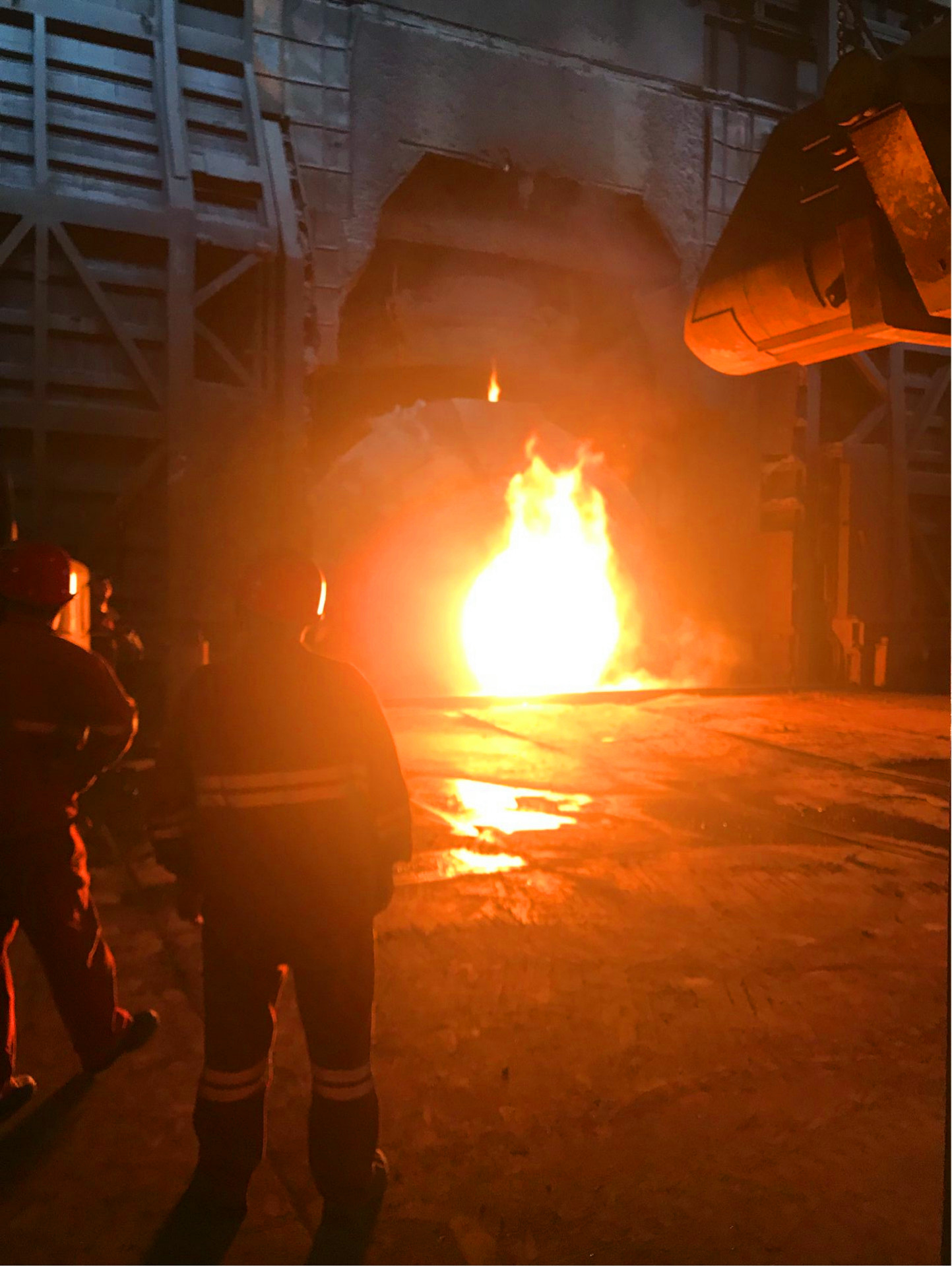 图8 学生参观炼钢生产线(上),转炉炼钢(下)