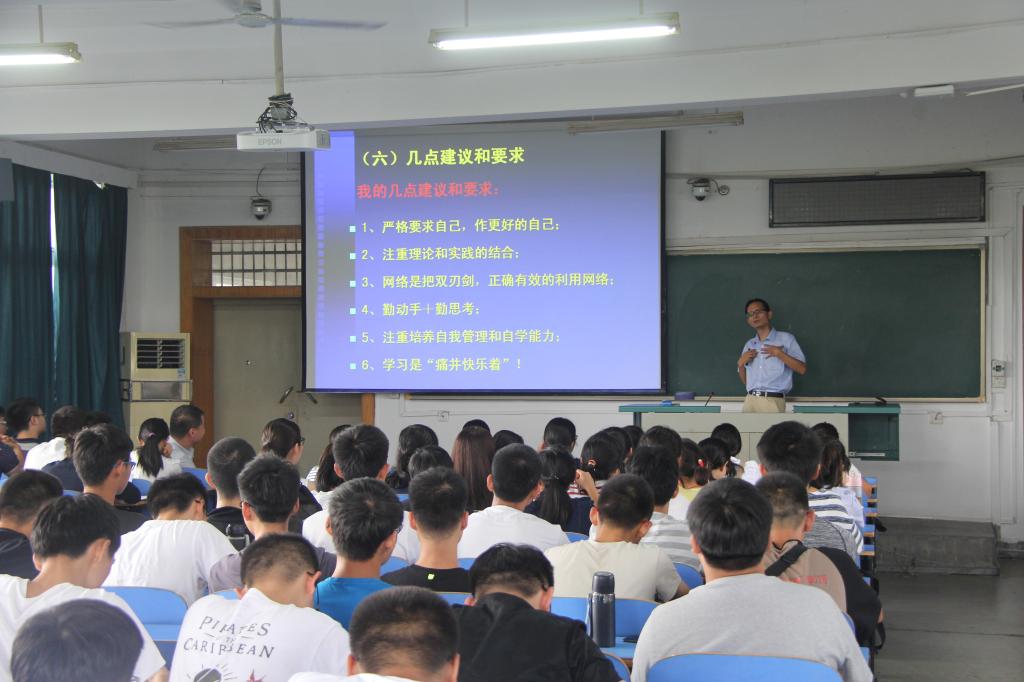 为在新老生之间实现“传,帮,带”,给新生树立一个良好的导向,9月7日我院组织了新老生交流会,高年级的优秀学生为2017级新生分享了自己的成长路径。会后,我院学生会、社团负责人对团委、学生会、侏罗纪电子制作协会进行了详细的介绍,并表示欢迎2017级新生的加入。9月7日晚,我校图书馆馆长徐世球在教三207为我院新生带来《读书与大学生素质教育》主题讲座讲座,讲解深入浅出,赢得同学们阵阵掌声。9月8日由学工组、教务科老师们向同学们讲解《学生手册》,重点强调了学习制度、学风建设、奖励资助及考核评优制度等,下午各班级组织召开了新学期第一次班会暨新生班主任见面。