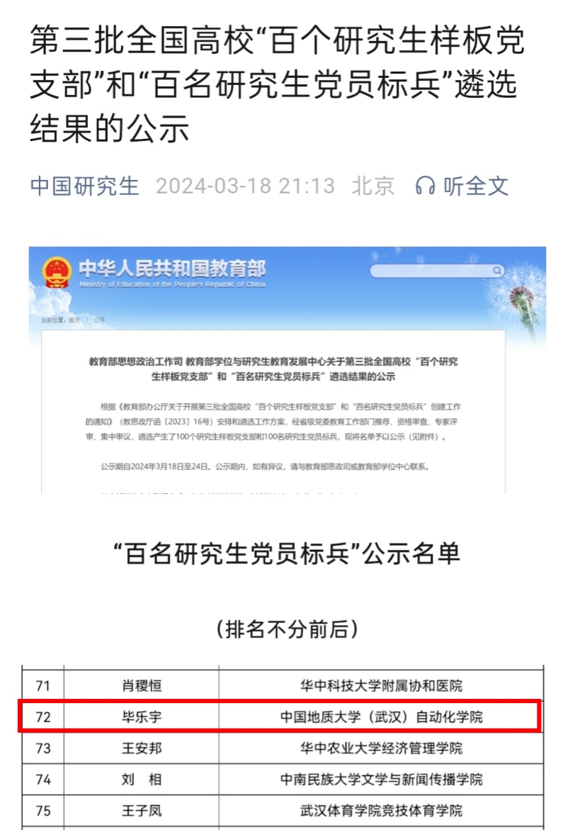 近日,教育部思想政治工作司、教育部学位与研究生教育发展中心公示了第三批全国高校“百个研究生样板党支部”和“百名研究生党员标兵”遴选结果,全国遴选产生了100个“研究生样板党支部”、100名“研究生党员标兵”,湖北省7个研究生党支部和5名研究生党员上榜。