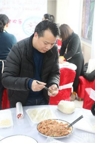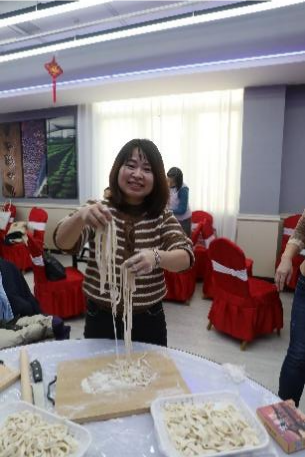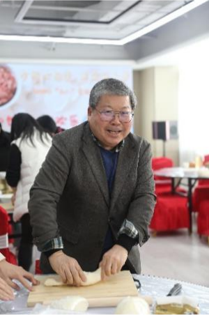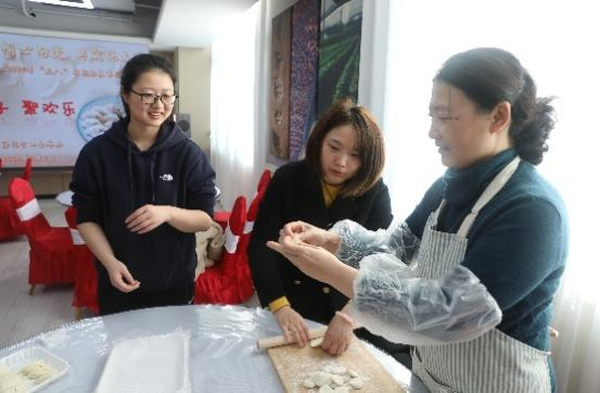活动现场,大家热情高涨,揉面团、擀面皮、包饺子,偌大的面团,在女教工一双双巧手面前变成了外形各异的饺子,充满寓意和想象力。大家配合默契、各显身手,忙得不亦乐乎,处处洋溢着“家”的味道和温馨。我院川田誠一教授也被现场快乐的氛围感染,参与其中,体验中国的传统文化,也使活动增添了跨文化交流的色彩。本次活动,受到女教职工欢迎,也得到学院领导的重视。部分女教职工和领导在完成下午的“预答辩”后赶来参加活动。在谈笑风生中,一盘盘热腾腾的饺子端上了桌子,大家共同分享劳动成果。