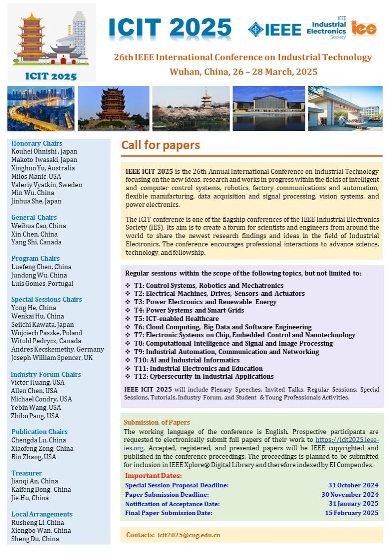 26IEEE国际工业技术大会(ICIT2025)将于2025326日至28日在中国武汉举办,由麻豆av 承办。ICIT2025重点关注智能和计算机控制系统、机器人技术、工厂通信和自动化、柔性制造、数据采集和信号处理、视觉系统和电力电子等领域的新思想、新研究和新进展。