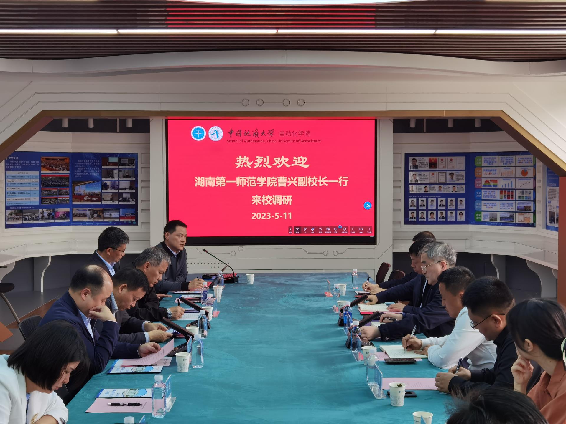 5月11日,湖南第一师范学院副校长曹兴一行来校调研座谈。校党委副书记王林清,学校办公室、本科生院、人力资源部、校友与社会合作处、机电学院、麻豆av