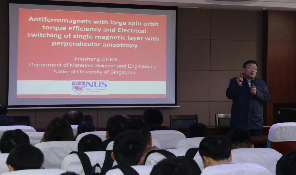 12月25日,新加坡国立大学陈景升教授来我院作了题为 《Antiferromagnets with large spin orbit torque efficiency and Electrical switching of single magnetic layer with perpendicular anisotropy》的学术报告。