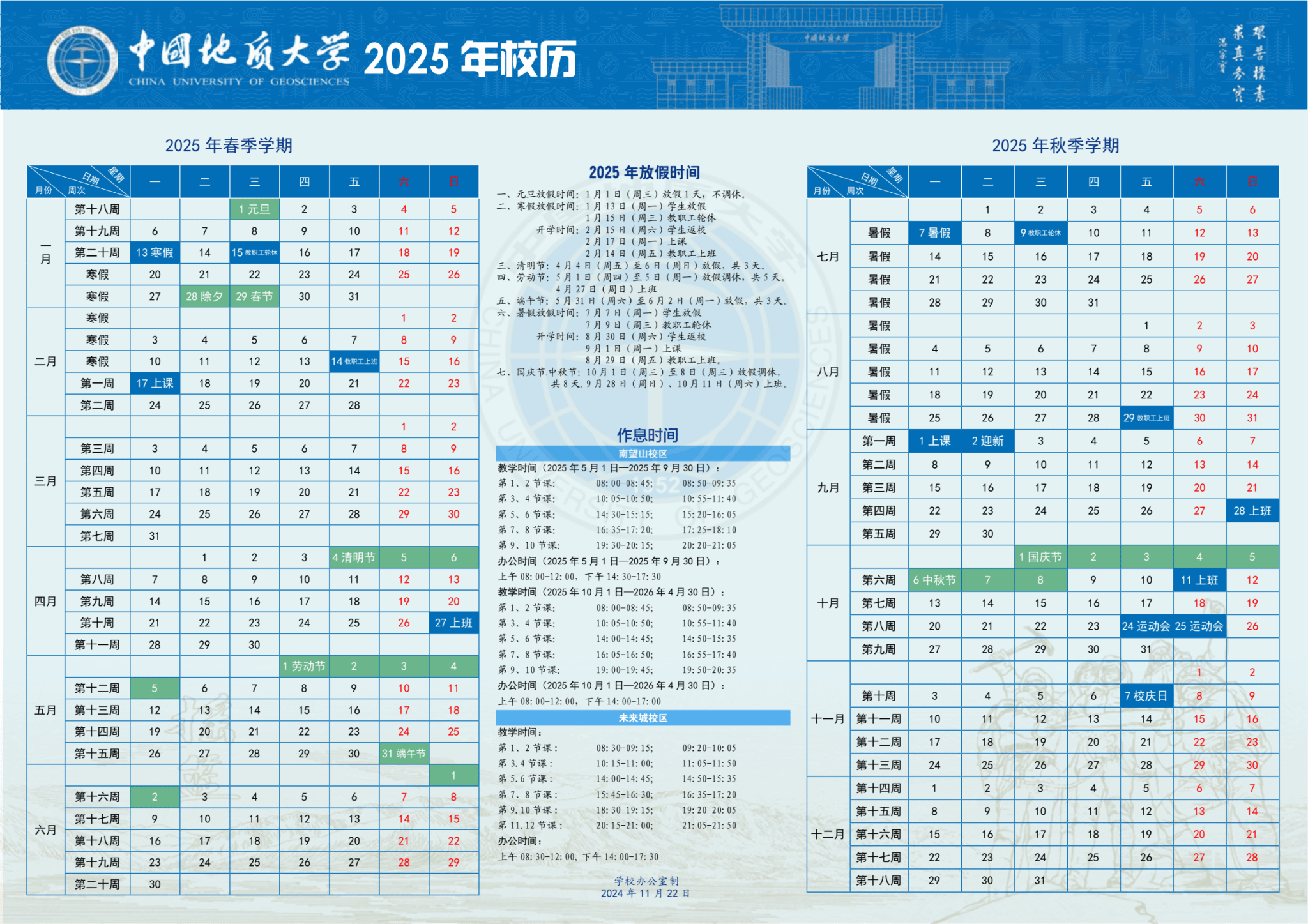 自10月1日起,调整作息时间,南望山校区办公时间调整为:8:00-12:00,14:00-17:00;学生作息时间见校历安排。