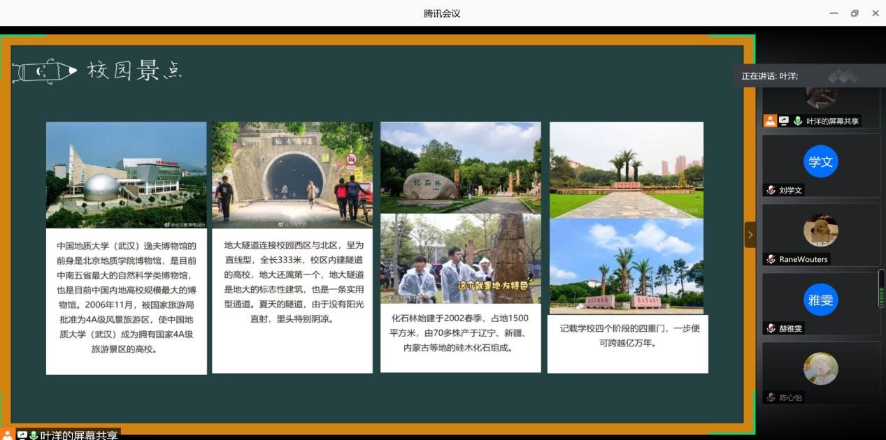 是国家“211工程”、“985工程优势学科创新平台”重点建设高校、国家“双一流”建设高校,地球科学领域进入ESI学科排名前1‰,被誉为“中国地球科学的最高学府”。叶洋同学还介绍了学校的特色活动,零点升旗,新年音乐会,校运会开幕式。