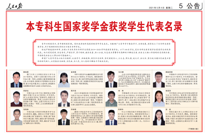 5月4日,人民日报刊发了2019-2020学年度本专科生国家奖学金获奖学生代表名录。经过严格选拔和评审,全国6万名优秀本专科学生荣获2019-2020学年度国家奖学金,100名学生入选本专科生国家奖学金获奖学生代表名录。我院柯帅名列其中,是我校唯一获此殊荣的在校生。