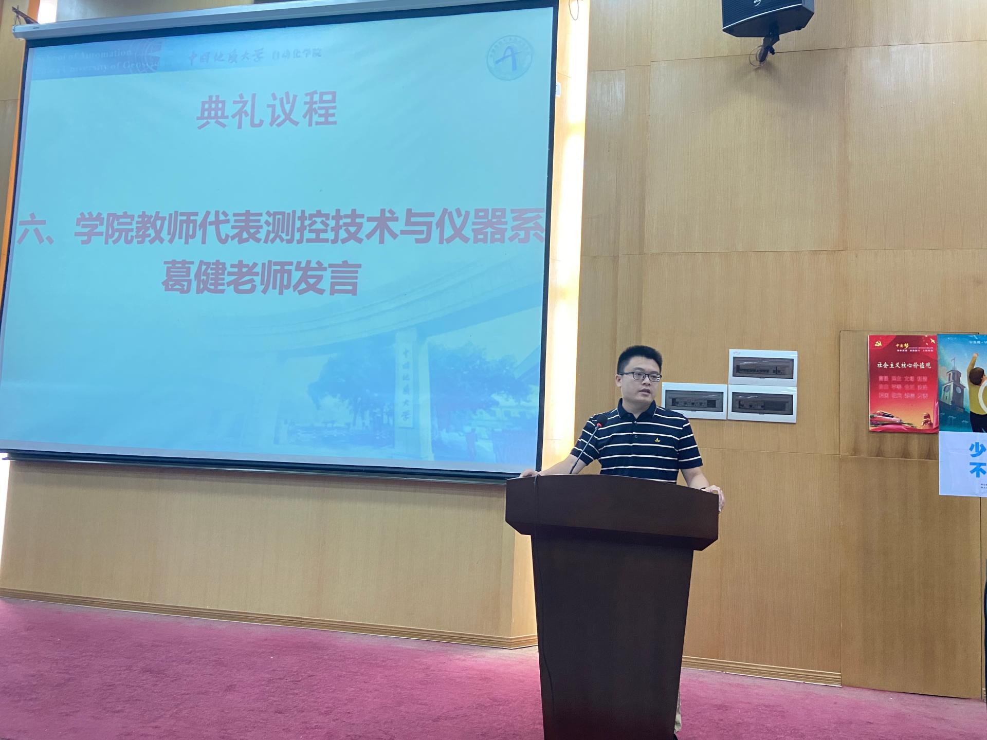 测控技术与仪器系葛健老师代表学院教师发言。他希望同学们可以树立崇高理想,刻苦学习,始终为了自己的梦想努力奋斗,把个人的成长与学院和学校的发展融合起来,成为新时代的优秀创新人才。