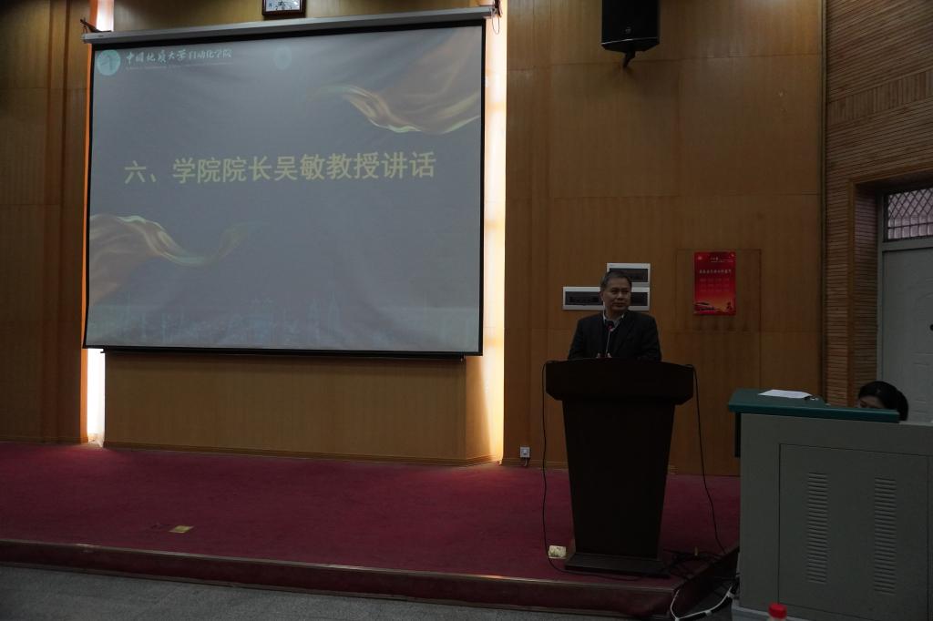 院长吴敏教授讲话。吴老师肯定了举行此次活动的重要意义,他表示,此次活动培养了学生专业学习兴趣,使学生了解了祖国建设对自己所学专业的需要,从而激发了学生的爱国心与报国情。随后,吴敏教授表达了对“走进自动化”系列活动能成为一种常态化的活动,且每年能越办越好的期待,最后,他预祝同学们对自动化能有更深刻的理解,能够凭自身技术能力挑起大梁,建设祖国。