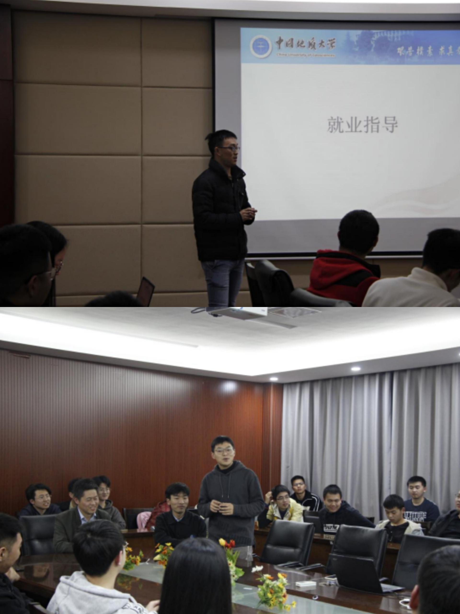 首先,辛浩男学长分享了自己对保研各方面的认识,告诉同学们绩点是王道,需要全面了解老师,保研是场持久战,要综合考虑,切勿急躁。接下来,研究生学长廖宇航分享自身考研经历和对考研的认识。首先,他谈到总体规划。第一,关于选择。学长深知面临日后抉择时同学们的茫然,他建议同学们尽早做出选择,留下更多的时间;不要随波逐流,适合自己的才是最好的;对于自己选择的事情要坚持到底。然后闫晴晴学姐分享自己的考研经验,学姐也提出了自己的各科学习方法以及各科书籍推荐,希望同学们规划好时间,与朋友们互相激励,放平心态。接着,喻学孚学长给同学们讲解就业指导。他建议同学们提早进行规划,并指出英语四六级在各种方面的重要性,分析地域,行业,发展三个就业方向,事业单位,国企,民营企业这三个单位类型,同时也简单介绍了事业单位和企业的就业流程与需要注意的细节。