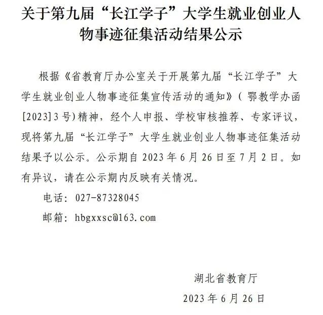 近日,湖北省第九届“长江学子”大学生就业创业人物事迹征集活动评选结果揭晓。经学院推荐、学校推荐、专家推选等环节,麻豆av 2019级本科生刘学文同学成功获评湖北省自强奋进类“长江学子”称号。