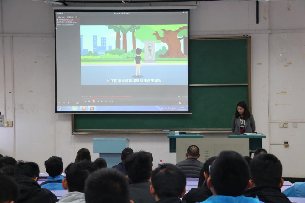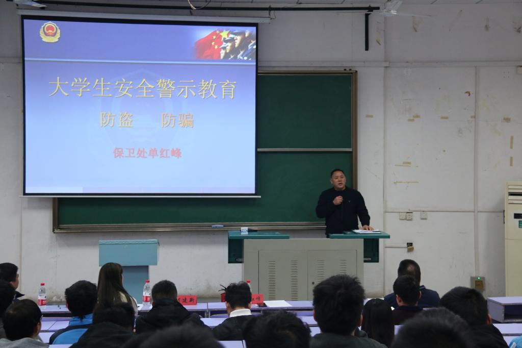 校保卫处副处长单红峰作“大学生安全警示教育——防盗、防骗”知识讲座。单处长指出,作为大学生,保管好财物是一项重要能力;通过对近年来发生在我校的典型案例来警示同学们防盗、防骗意识的重要性,对如何防盗、防骗的方法重点展开讲解。