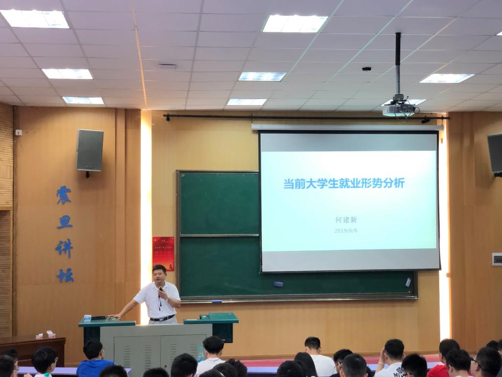 (通讯员 李宁)为提高我院学生就业质量,促进学生充分就业,结合我院实际情况,特制定2016级学生就业形势分析课程,第一讲课程由学院党委副书记何建新老师授课,何老师主要结合时代需要为同学们分析了当前大学生所面临的就业形势。