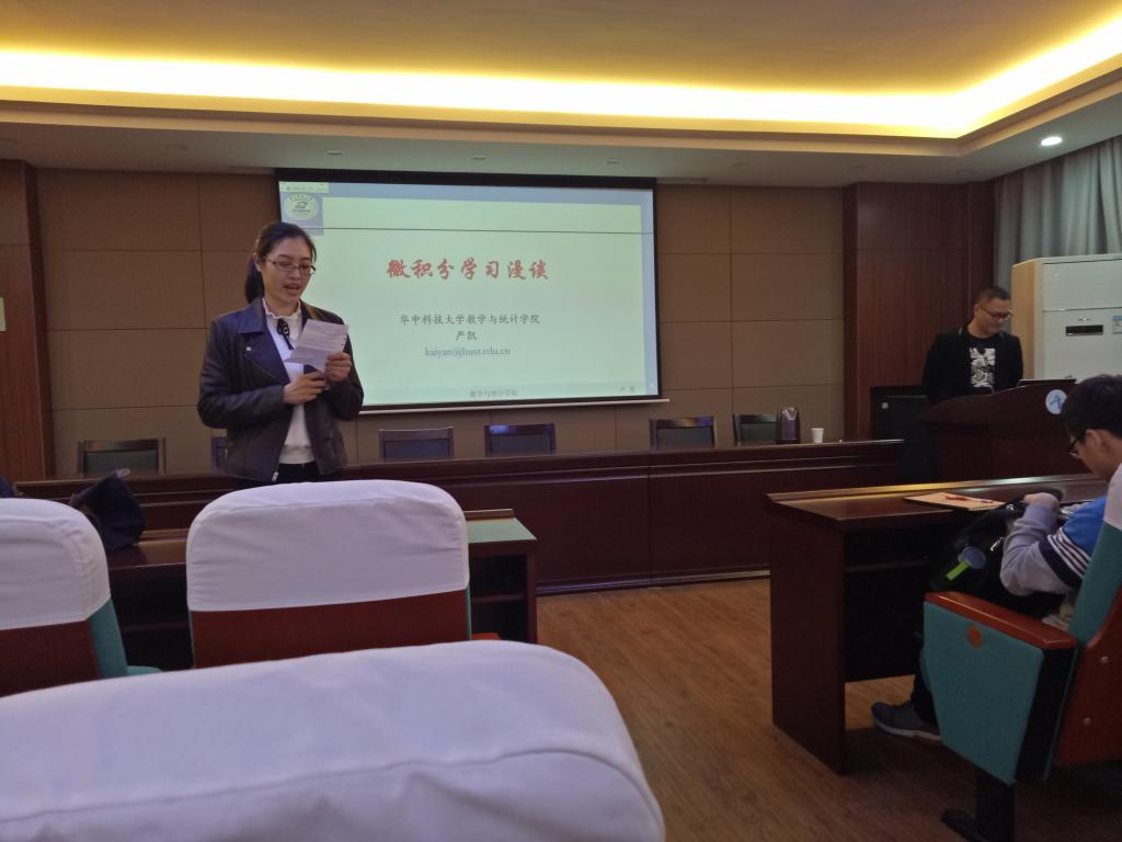 (通讯员 余博威)2018年4月15日晚,我院“微积分学习漫谈”讲座在信息楼310报告厅顺利举行,讲座邀请华中科技大学数学与统计学院严凯老师主讲,朱媛老师主持讲座。