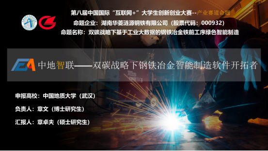 “中地智联——双碳战略下钢铁冶金智能制造软件开拓者”团队主要由我院博士研究生章文、章卓夫、王炎、梁静杰等十余名硕博研究生组成,陈略峰、胡杰、杜胜、王向东、王艺霖等老师共同指导。该参赛团队的命题发榜单位为——湖南华菱涟源钢铁有限公司(股票代码:000932),在成功揭榜后,团队基于命题要求,依托自身多年在钢铁冶金领域的前沿技术积累,深入企业交流,定制化改进了钢铁全流程集中监控软件、淬火过程板形控制软件和干熄焦过程控制软件,自主设计了一套基于工业大数据的钢铁冶金全流程智能管控系统,使钢企的工作效率大幅度提升,实现生产过程中的节能减排,达到降本增效的经济效益,助推钢铁企业的绿色智能制造转型。