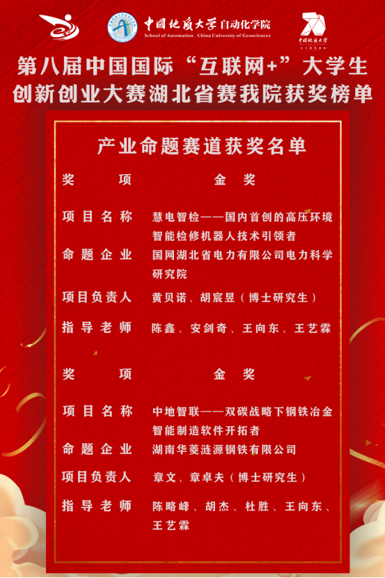 7月29日-30日,第八届中国国际“互联网+”大学生创新创业大赛湖北省复赛以线上线下相结合的形式举行。在本届赛事中,湖北省累计有9.5万余个项目、43万多人次报名参赛,我院两支由硕博研究生作为主力参赛队员的项目在经过层层激烈角逐后突出重围,勇夺湖北省赛区产业命题赛道两项金奖,实现了学院参赛以来金奖数量从“0”到“2”的突破,也是学校在产业命题赛道的历史最好成绩。
