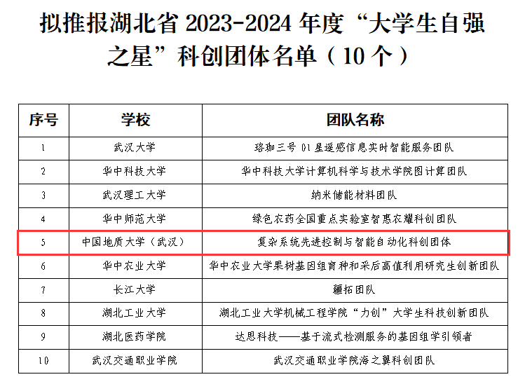 为深入贯彻落实习近平总书记关于青年工作的重要思想,动员引领广大团员青年为强国建设、民族复兴伟业挺膺担当,团省委、省学联组织开展了湖北省“大学生自强之星”推报活动。经高校申报、省级遴选等环节,共评选出湖北省“大学生自强之星”科创团体10个,其中,麻豆av 复杂系统先进控制与智能自动化科创团体,荣获湖北省2023-2024年度“大学生自强之星”称号。