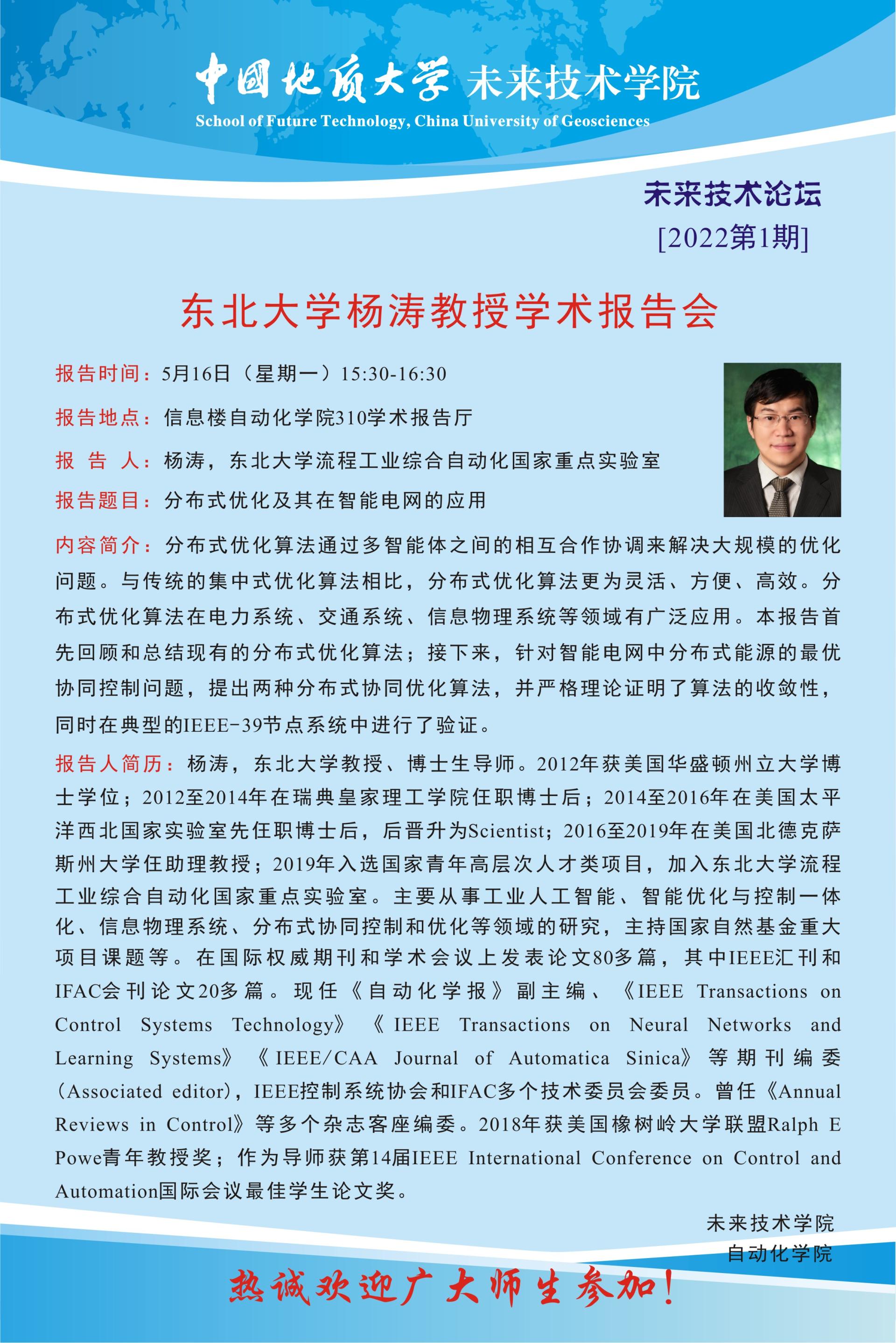 自动化学术论坛[2022第20-21期]:东北大学杨涛教授和华中科技大学袁烨教授学术报告会
